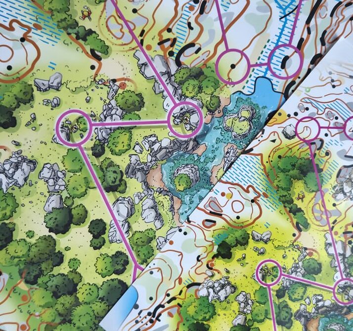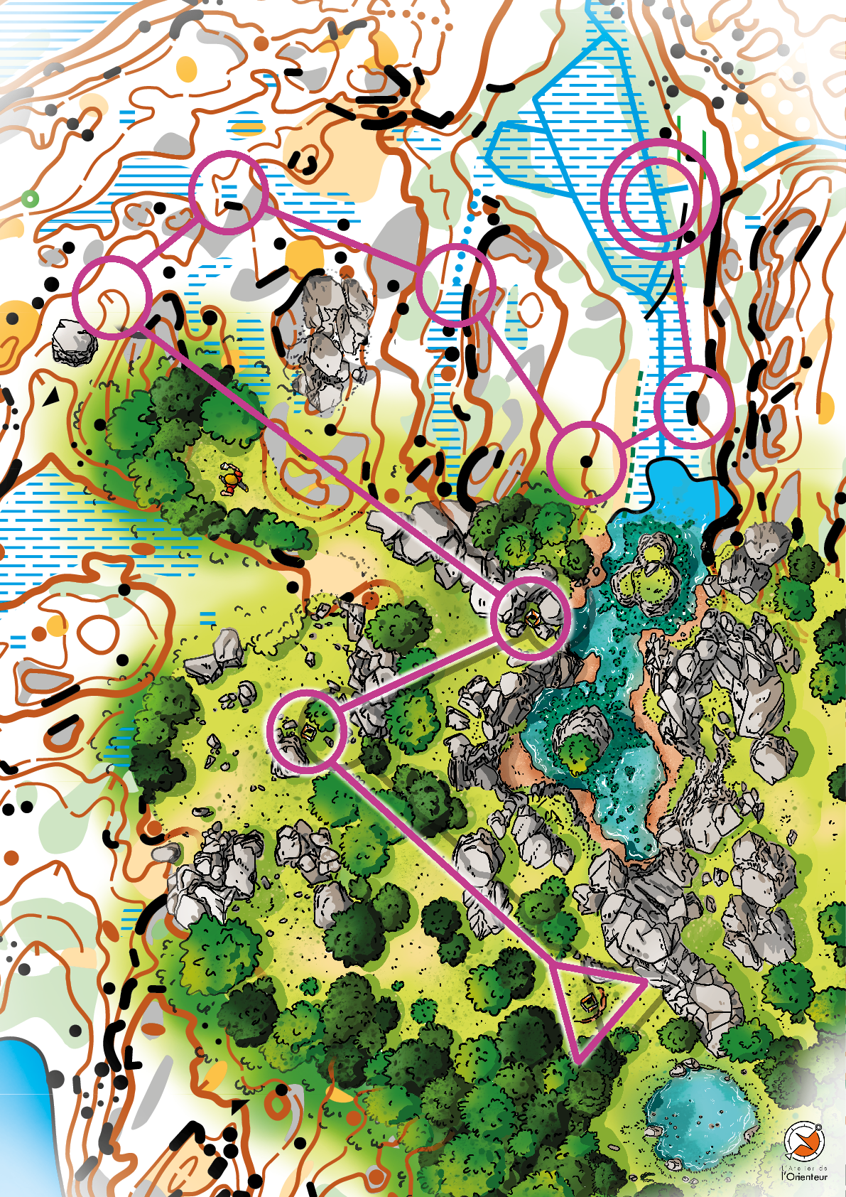 - Description : Vue aérienne d’un terrain avec un orienteur sur son parcours puis dégradé avec la carte de course d’orientation.